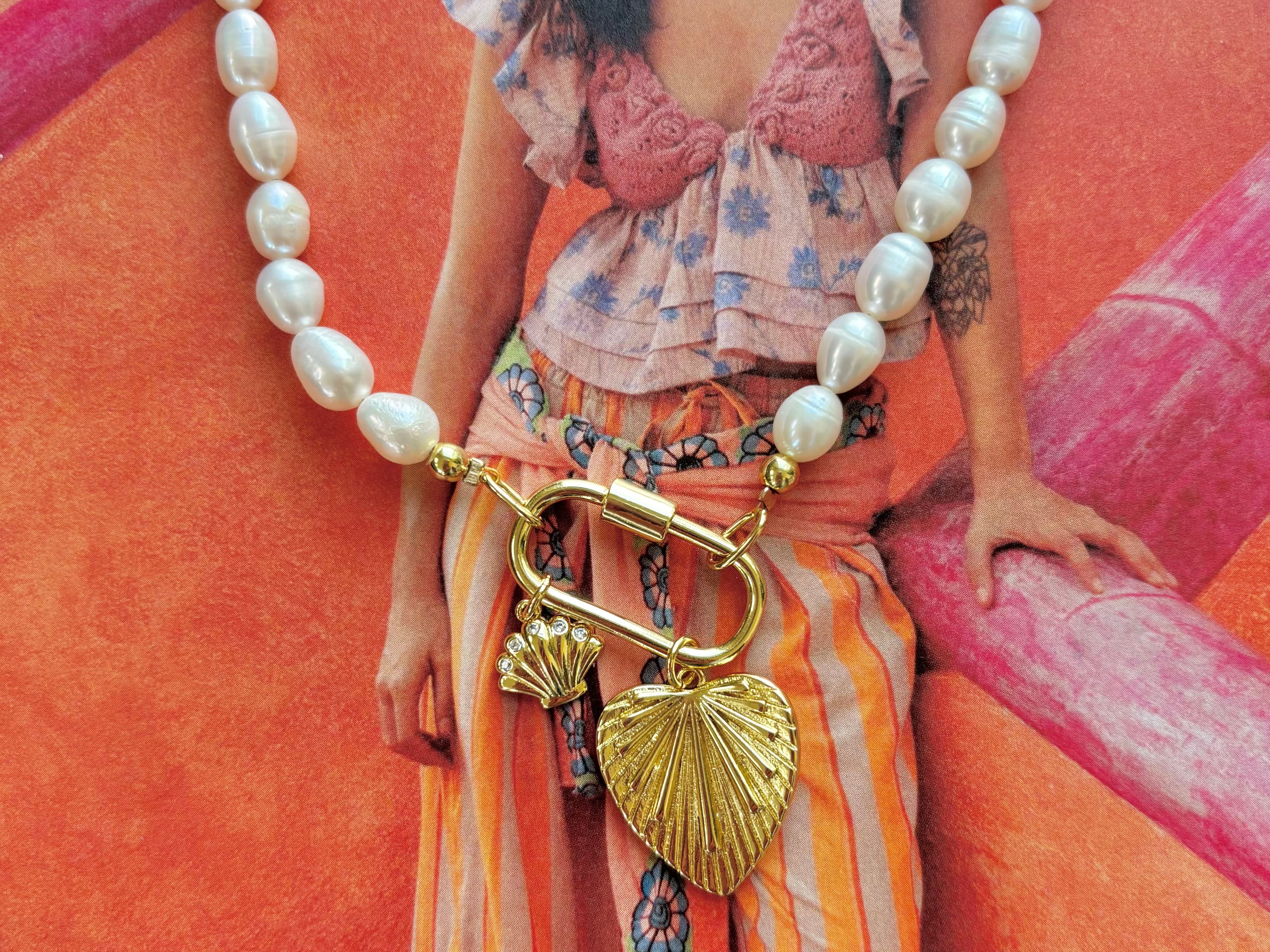 Freshwater pearls hand strung with a gold filled carabiner clasp, a seashell charm and a textured heart charm. Unscrew the carabiner to take the charms on and off for ultimate versatility! Measuring at approx 16” long.
