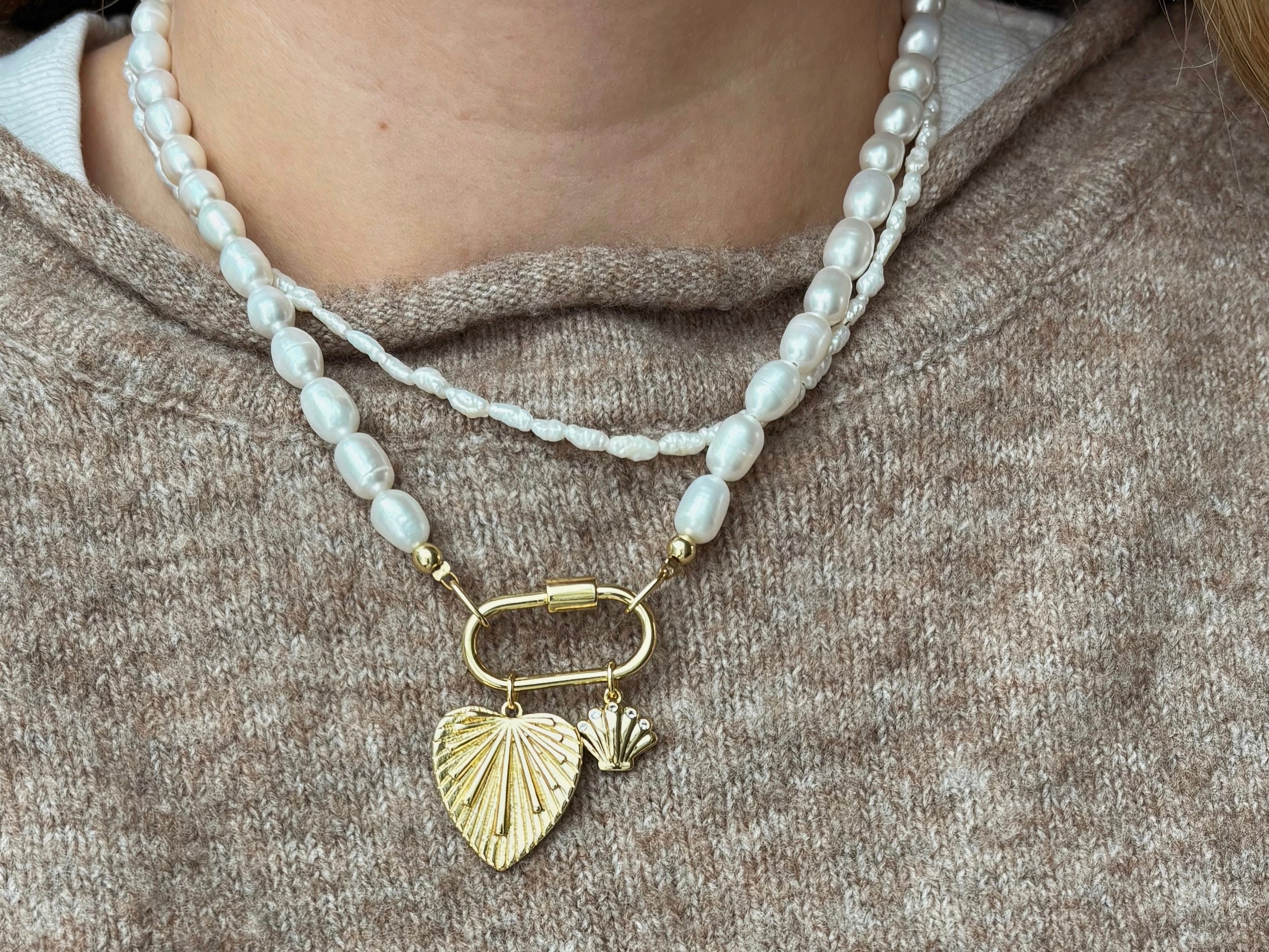 Freshwater pearls hand strung with gold filled components including a carabiner clasp, a seashell charm and a textured heart charm. Unscrew the carabiner to take the charms on and off for ultimate versatility! You will also unscrew the carabiner to put the necklace on and off. Entire necklace measures approx 16” long.