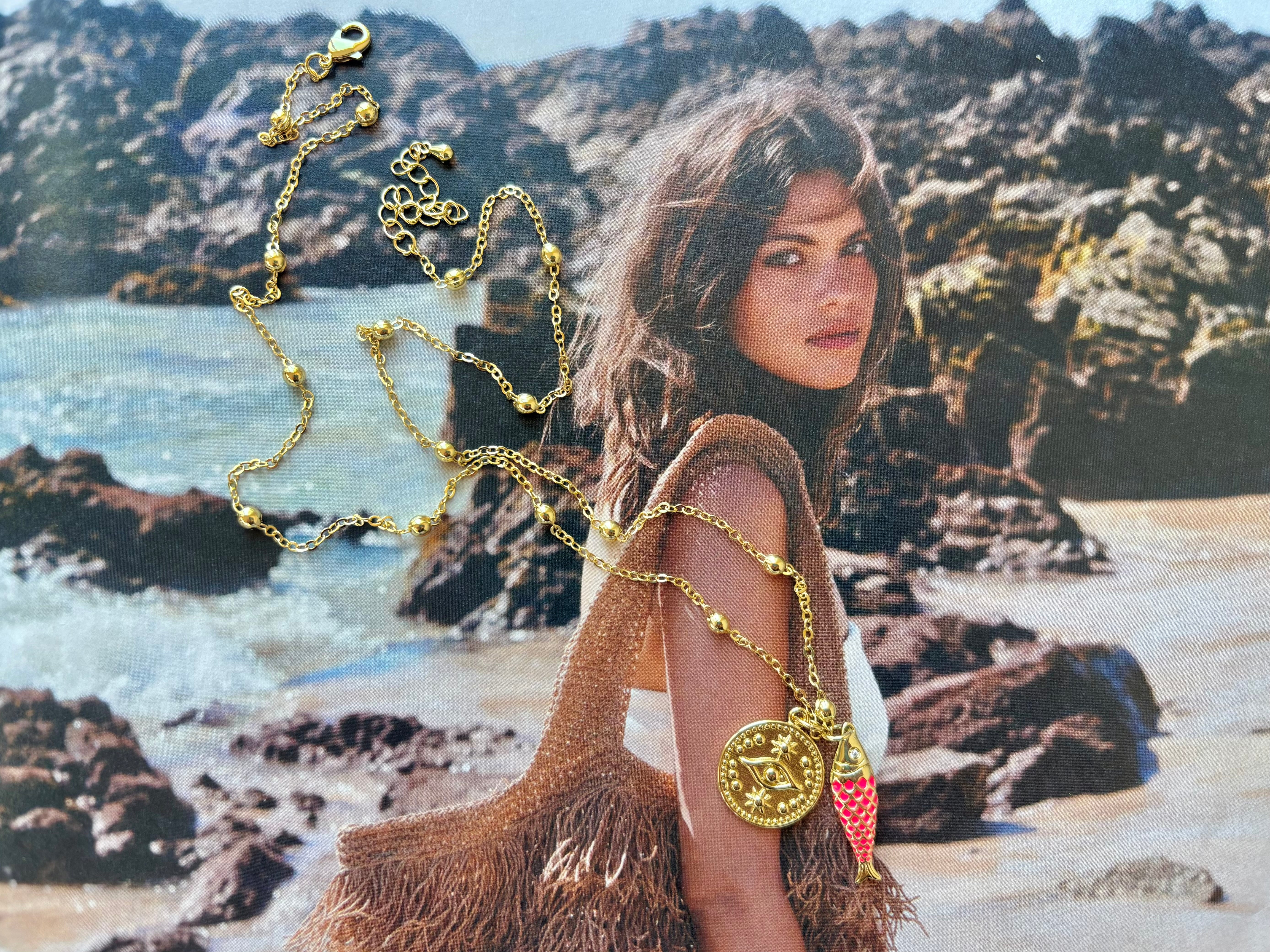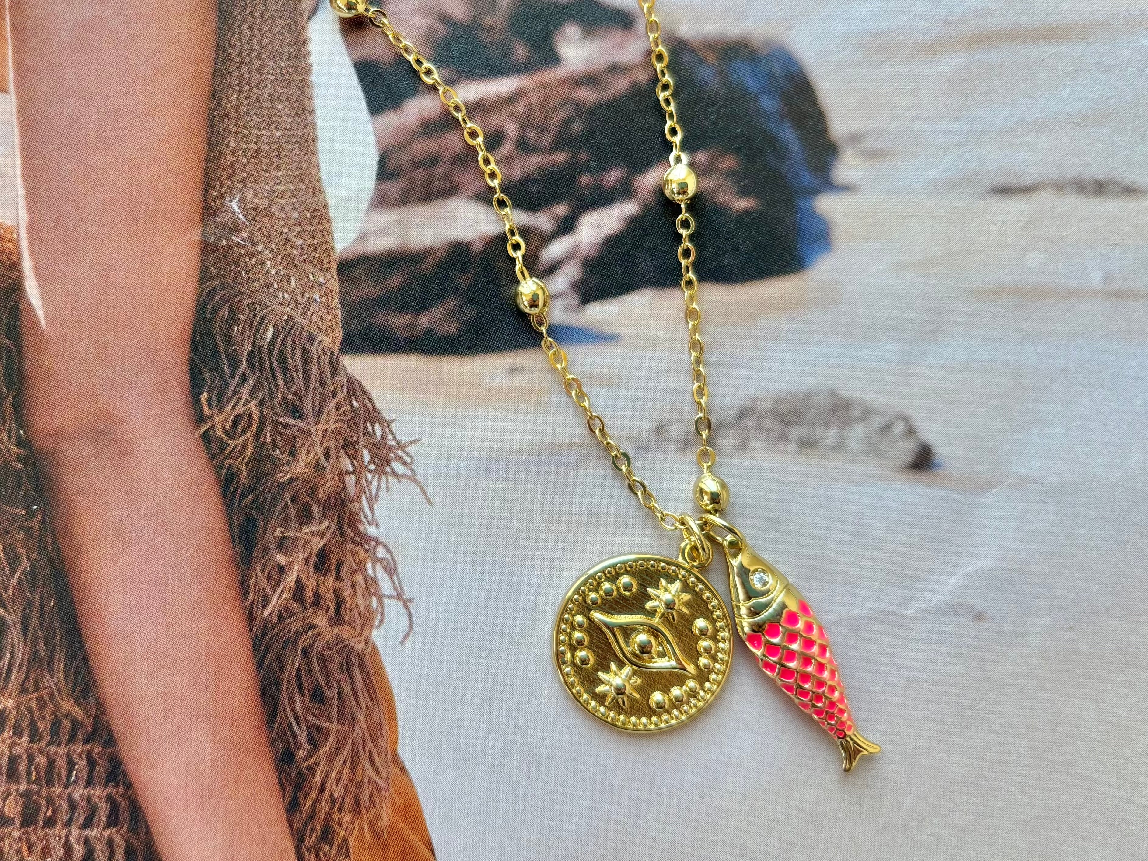 A bright and fun gold-filled ball chain necklace measuring at 21” with a 2” extender. Two lucky charms including an evil eye disc and a pink enamel sardine fish.