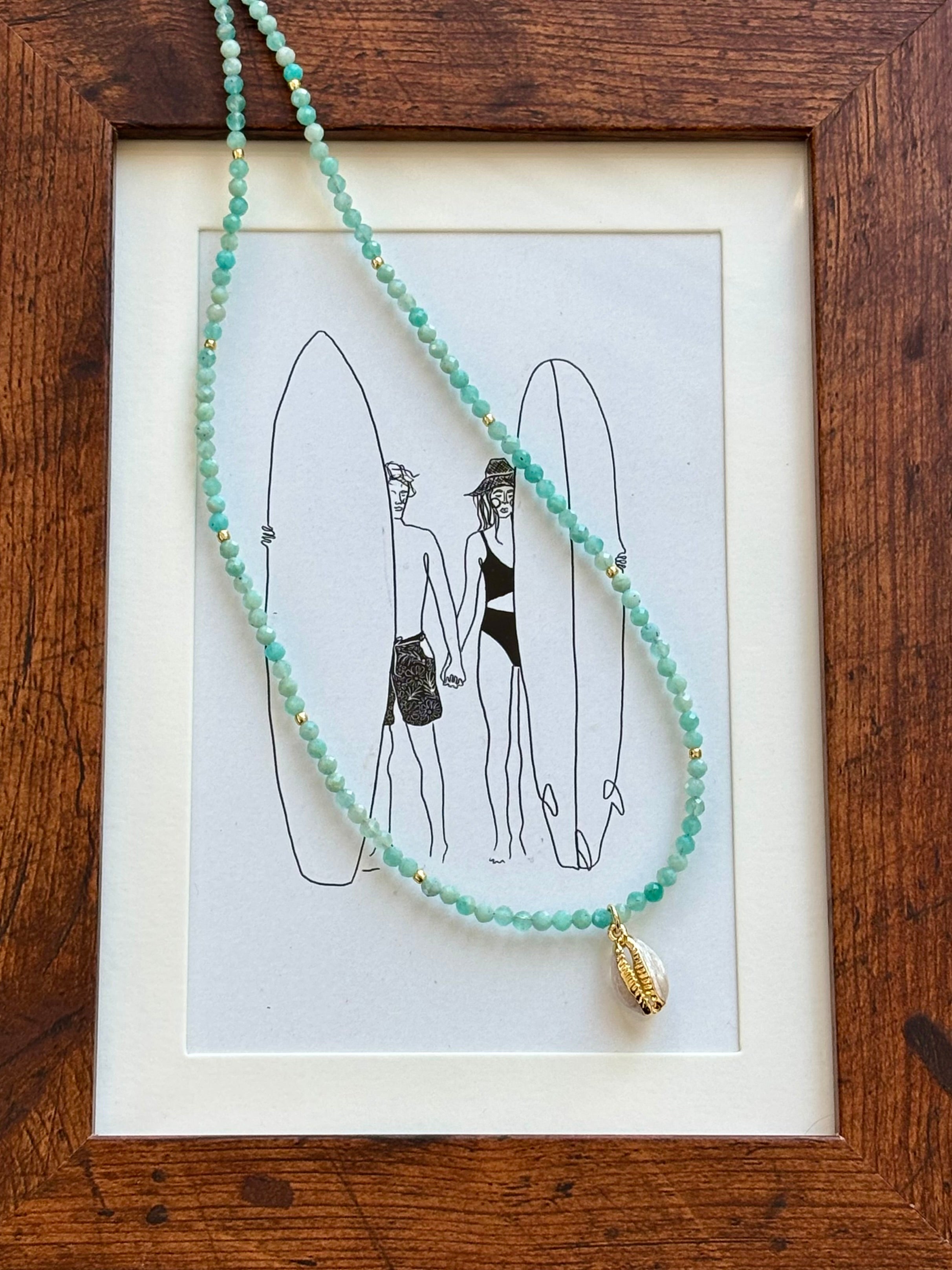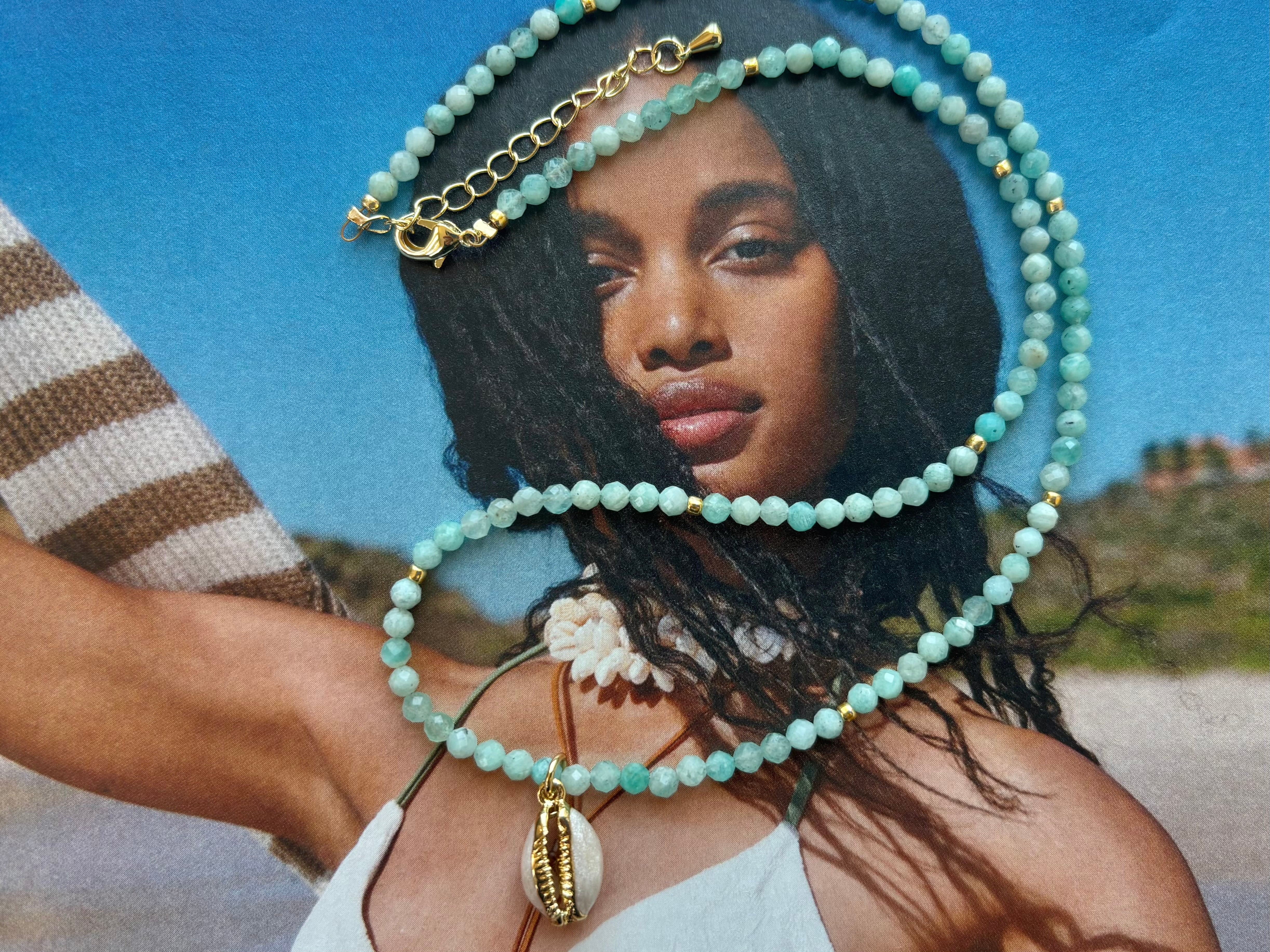Stunning 3mm faceted Amazonite gemstones hand-strung with an enamel cowrie shell charm. This necklace reminds me of the clear-blue waters in the gulf coast of Florida. Measures 16” with 2” extender. Gold-filled components.