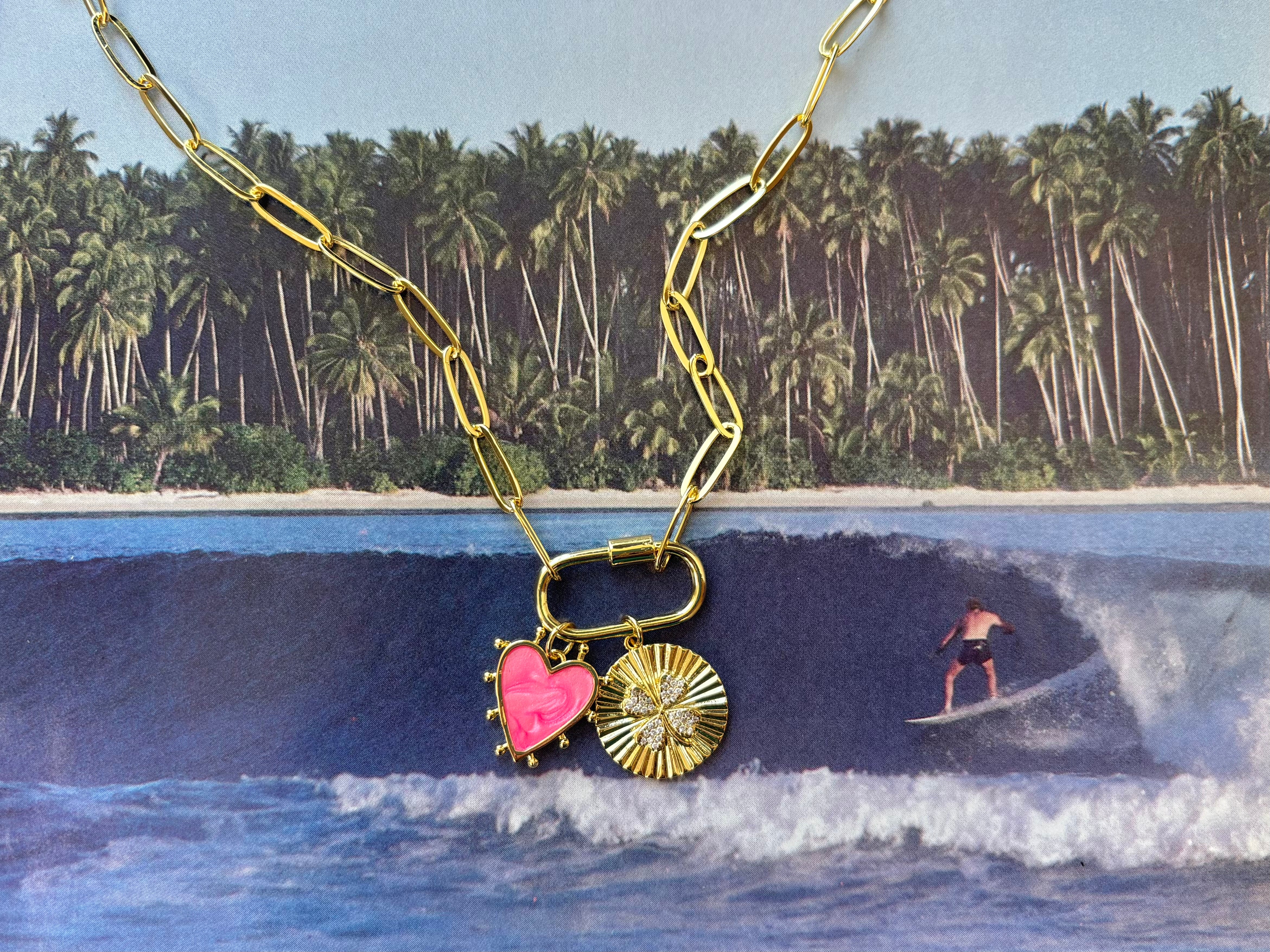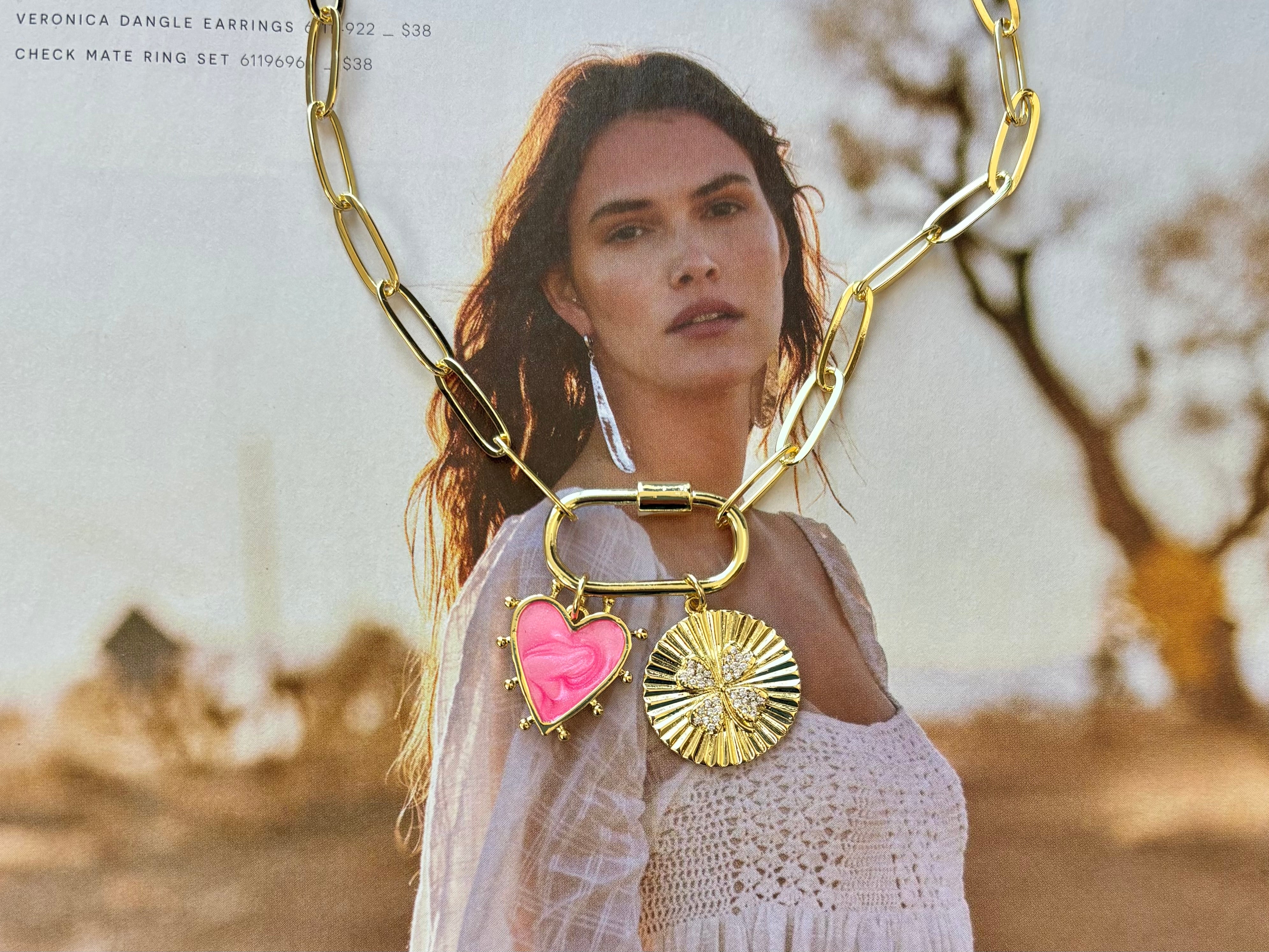 A whimsical charm necklace featuring a hot pink enamel heart charm and a clover disc charm. Slide them on and off the carabiner for ultimate versatility! Gold-filled paperclip chain. Measures 17” long but if you need a different length please leave a note in the checkout section.
