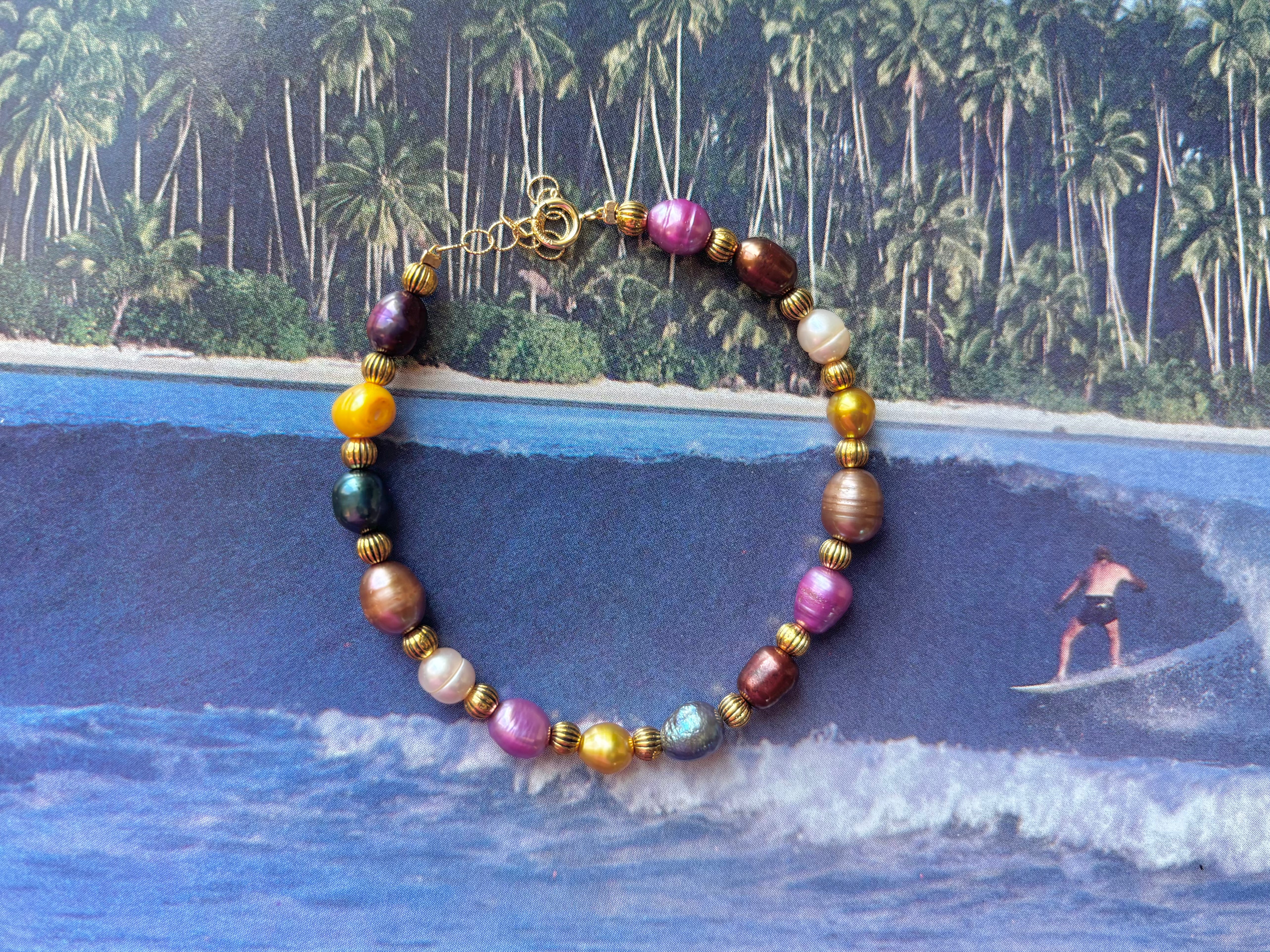 This freshwater pearl bracelet creates a captivating ombre effect reminiscent of a summer sunset. Pearls ranging from yellow to purple and burgundy. Antique gold spacers and a gold filled clasp. Measures 6” + 1” extender.